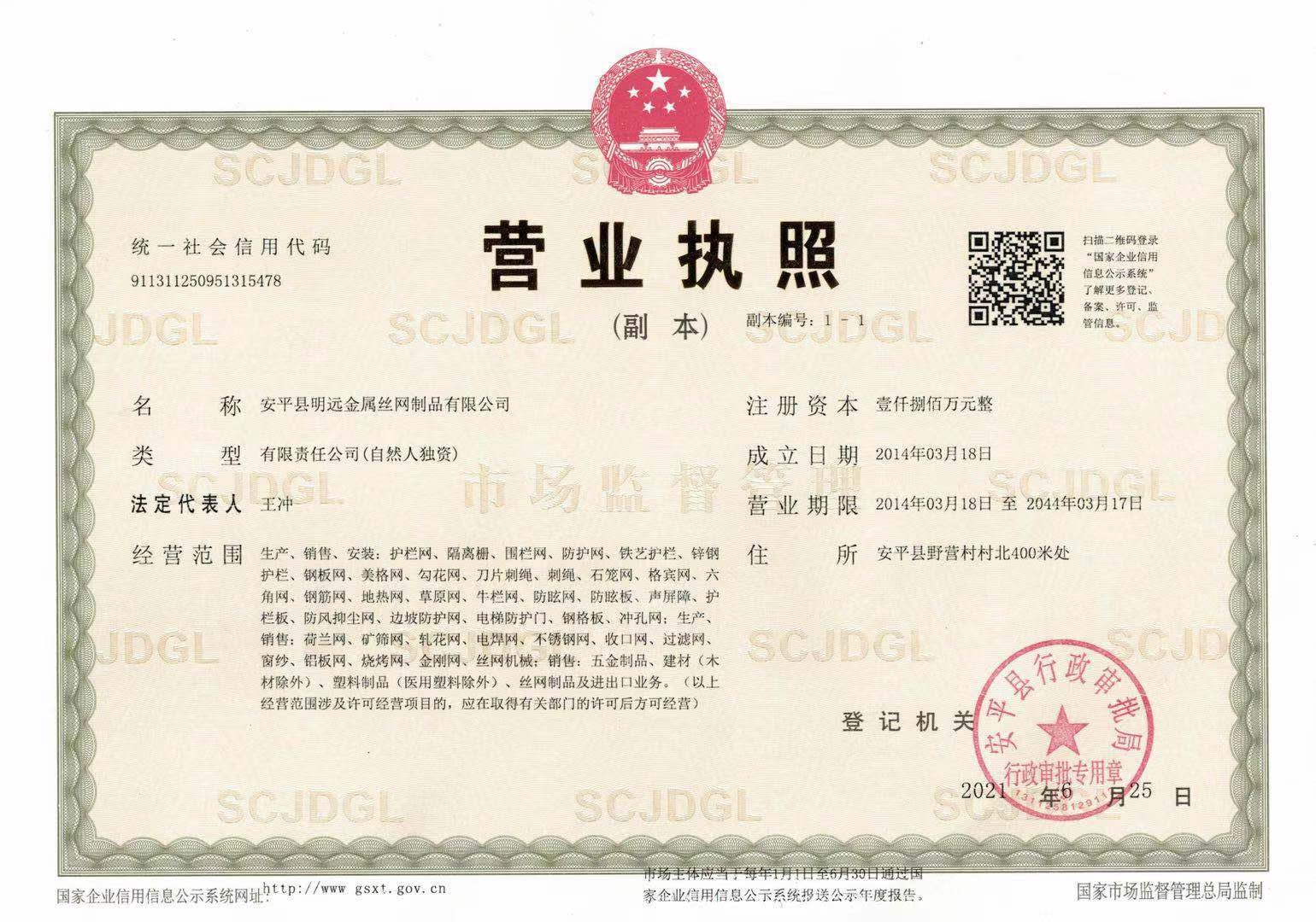安平縣明遠(yuǎn)金屬絲網(wǎng)制品有限公司 - 座落于絲網(wǎng)產(chǎn)業(yè)基地河北安平,二十年絲網(wǎng)制作經(jīng)驗(yàn),是一家從拔絲、焊接、打砂、折彎、鍍鋅、噴塑、浸塑、為成品,生產(chǎn)研發(fā)安裝為一體的交通工程護(hù)欄網(wǎng)、光伏景區(qū)圍欄網(wǎng)專業(yè)型企業(yè)。明遠(yuǎn)公司擁有先進(jìn)的生產(chǎn)設(shè)備,全自動(dòng)浸塑、噴塑、鍍鋅生產(chǎn)線,電腦焊網(wǎng)機(jī)組,聯(lián)合壓力機(jī),數(shù)控折彎?rùn)C(jī),槍尖沖孔機(jī)等多臺(tái)輔助設(shè)備,具有大批量生產(chǎn)能力。
